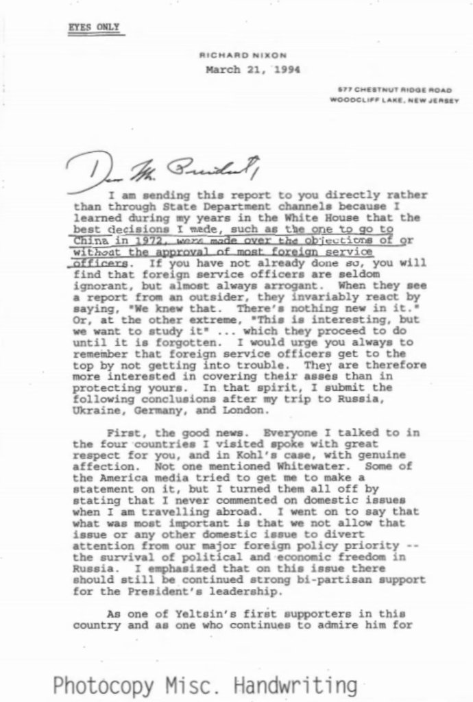 President Nixon warned, but it looks like in vain. However his words stayed, to be read and used as a guidance for the future HR’s! Below is the first page of his EYES ONLY letter to President Clinton of March 1994! The “covering of their asses” overtakes the care for the country!